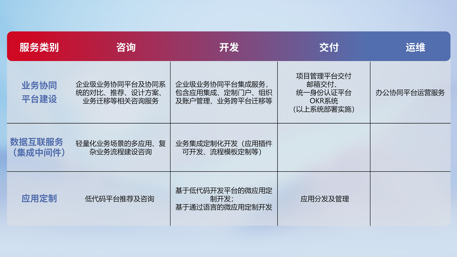 针对钉钉、、、、企微、、IDaas等平台级产品提供产品的规划、、、、方案、、、、交付、、定制化开发等服务,,,,实现如统一协同办公、、、智能客户服务、、、混合会议管理、、、、智能数据查询、、、、等业务场景,,实现数字化转型。。。